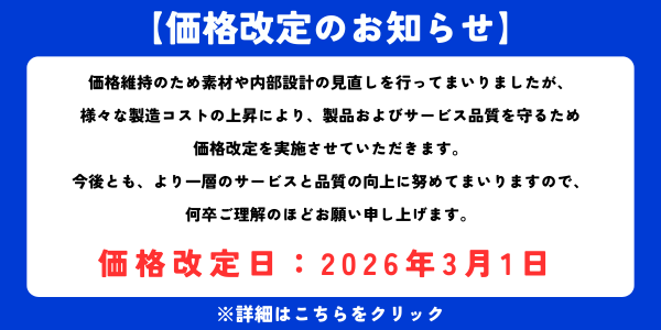 エアバブ本体につきまして、価格維持のため素材や内部設計の見直しを行ってまいりましたが、様々な製造コストの上昇により、製品およびサービス品質を守るため、価格改定を実施させていただきます。
